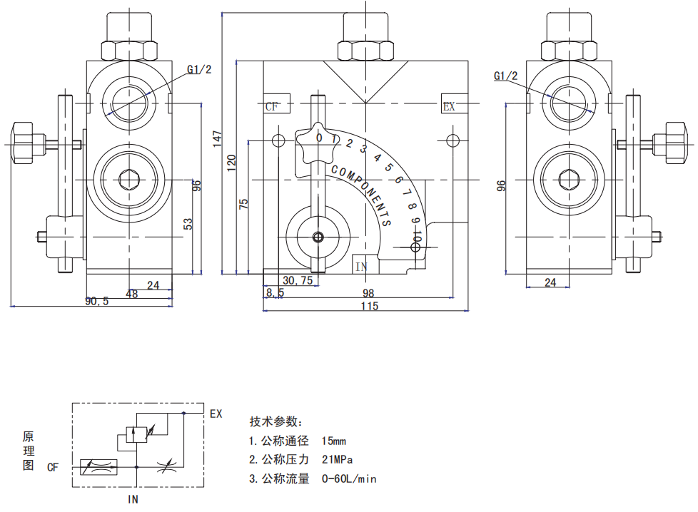 LKF全范圍壓力補(bǔ)償可變流量控制閥。經(jīng)過精心設(shè)計(jì),它的節(jié)流口面積會(huì)隨著閥桿的旋轉(zhuǎn)而變化。不論CF油口EX油口的壓力如何變化,控制油口的流量始終是平穩(wěn)恒定的。它擁有一個(gè)可調(diào)節(jié)的彈簧安全閥使壓力可以上升到設(shè)置的安全壓力。安全閥的壓力出廠設(shè)置是1500psi可調(diào)節(jié)范圍是750-3000psi。
